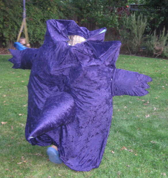 primero, un brindis por mi inspiración y enraizamiento sección, 7 años de edad C. Este es Pokemon Halloween 2.0, menos complejas que Kyogre del año pasado, pero un nuevo reto estructural. ¿Cómo hacer de una forma fantasmal bola que es lo suficientemente grande y suficientemente ligera para el cuerpo de un niño pequeño? Mis primeros pensamientos de espuma todo fueron desguazados inmediatamente como siendo demasiado costoso. Maché de papel iba a ser demasiado pesada. Introduzca el alambre de pollo: ligero, flexible y apenas el tamaño correcto! Y bendiga a Gengar por definirse en gran parte por los ojos y la sonrisa, así que no importa el éxito del cuerpo, ningún aficionado de Pokemon error le. Dad, sin embargo, era escéptico; no
