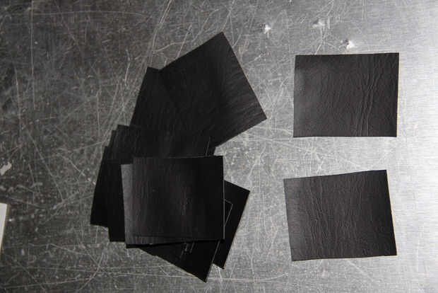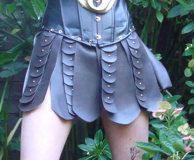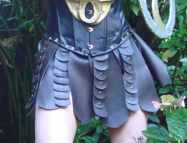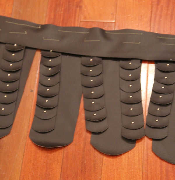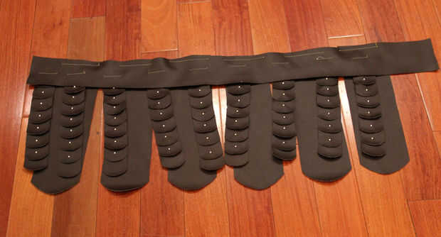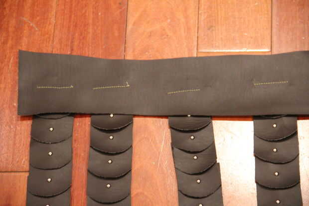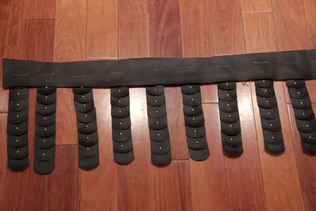 Corte un pedazo largo flaco de piel artificial del tamaño de nuestra cintura + 5 ". Coser las aletas pequeñas de la piel artificial los entre 2-3 pulgadas aparte.