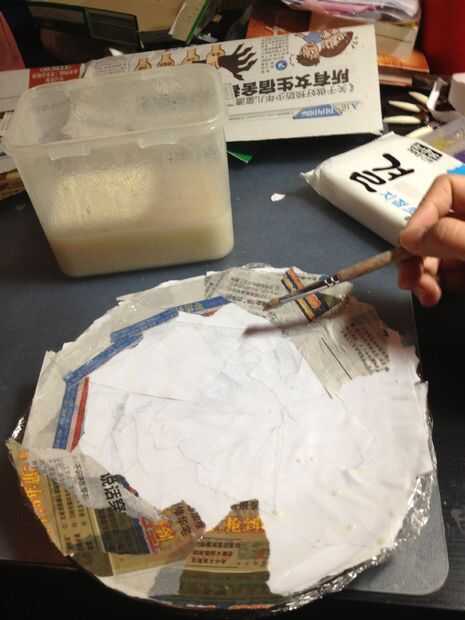 2. papel maché! Se puede usar pegamento blanco para esto, pero ya que (para mi disgusto total) no pude encontrar ningún pegamento blanco en las tiendas de papelería chino, hice mi propia receta de pegamento, que es 1 parte de harina por 4 partes de agua, con una pizca de sal para prevenir el moho. Revuelva la mezcla de fondo (para evitar grumos) en una olla y hervir sobre la estufa. Dejar hervir durante 2-3 minutos y vierta en un recipiente hermético. Puedes mantener en la nevera por hasta una semana.