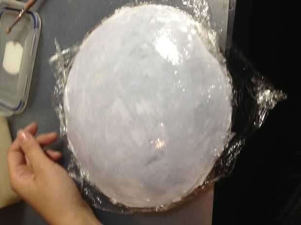 3. Extraiga la máscara húmeda y frágil de la tapa tirando del film transparente, y luego retire el film transparente y déjelo secar completamente. Mientras esto pasa, trabajo en los oídos (siguiente paso)