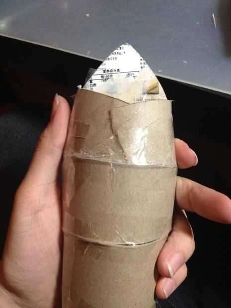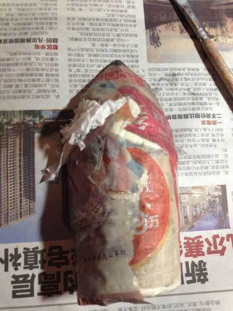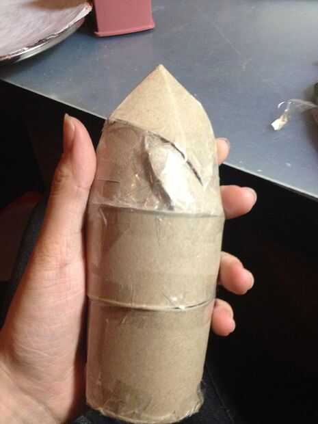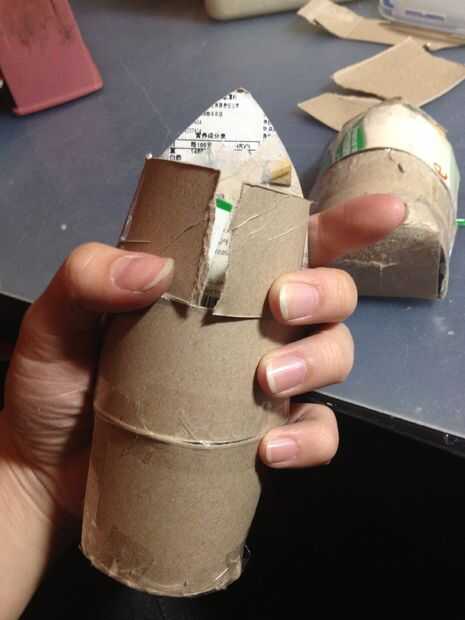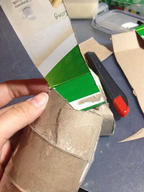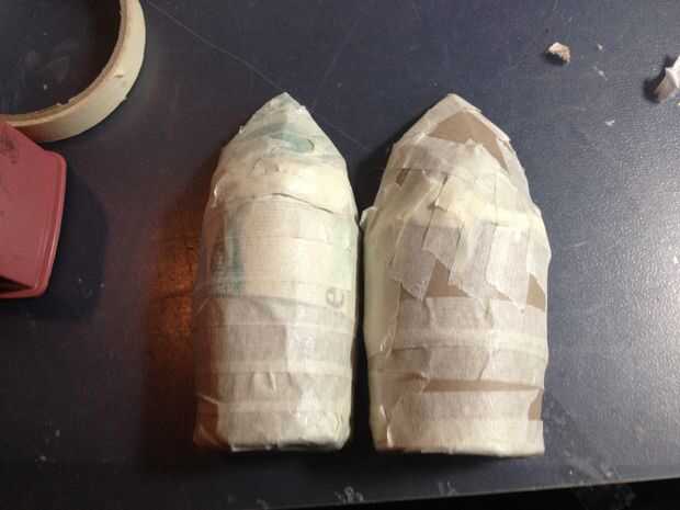 6. momificación todo en cinta de enmascarar, papel maché no se pega bien a la cinta transparente de plástico convencional, que es lo que usé. (Podría se utilizado cinta adhesiva para unir las piezas de la tarjeta, pero encontrar cinta adhesiva muy débil para las cosas de explotaciones bajo tensión, por lo que prefiero usar la cinta de plástico para unir cosas y entonces la cubierta de cinta adhesiva).
