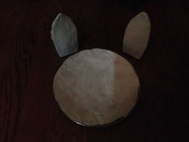 1. cortar una forma de oído áspera de la tarjeta, tarjeta de la caja de cereal está muy bien. Usé una vieja caja de mezcla de pastel. Dejar un poco en la parte inferior de la base de la oreja.