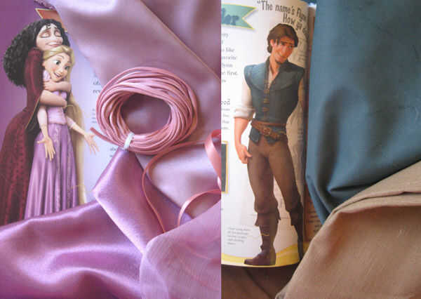 Una nota sobre la coincidencia de colores, había comprado un enredado libro infantil que sentía tenía imágenes precisas bonito color de los modelos 3d de la película (es decir no 2d ilustraciones o color sesgado humor imágenes de la película). Tomé este libro conmigo cuando compré las telas base (para las mangas del casquillo, las mangas más bajas y la parte no impresa-patrón de la falda). Recomiendo hacer este tipo de cosas cuando están recogiendo a telas. A menudo el color que recuerdas en tu cabeza no es del todo exacto. También puede encontrar buenas tomas en línea de tu personaje e imprimirlas, asegurándose de que su ordenador imprimir es como color exacto como sea posible. Cuando ves las imágenes de Rapunzel, la falda es un poco brillante con un poco de textura, así que fui no sólo que empareja el color, pero el brillo de la tela.