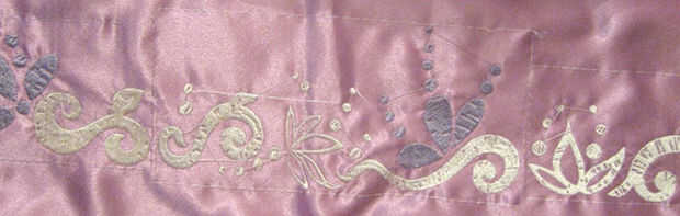 Para el bordado, saqué los patrones de la falda y las mangas de menor. Estudié varias imágenes y salió lo que yo pensaba era el patrón que se repite de los bordados. Esto tomó varios días. Realmente quería el bordado como de Rapunzel y si nos fijamos en los primeros planos en la película, su bordado tiene algunas lagunas y ligeramente espaciados hilos. Dibujé los "gaps" en mis diseños así. Yo dibujé a escala. Envié mis imágenes escaneadas a mi amigo, AJ, que digitalizaron para mí y luego los bordados con mi máquina sobre las telas. La falda era realmente difícil bordar porque es más de un color de hilo y cada patrón tiene que ser emparejado con mucho cuidado alrededor de la falda en orden para que funcione. Lo sentimos, mis archivos de bordados no son venta.