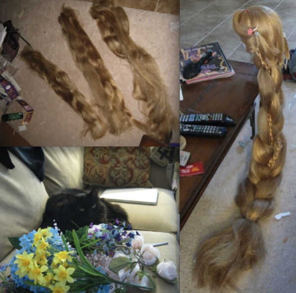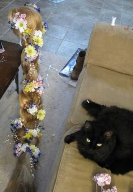 Entonces hice un montón de pequeños Ramos de flores de seda. Había atado utilizando el cable de las flores ellos mismos y luego fijarse a la peluca de la misma manera. Una de las cosas agradables acerca del cabello de Rapunzel siendo trenzado y cubierto de flores, es cualquier lugar que tiene un archivo adjunto de extensión del pelo, o un lugar que se ve gracioso... sólo puede ocultar en la trenza o pegar una flor grande.
