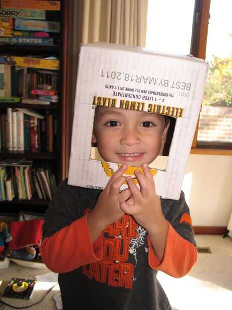 Después corté la casilla tamaño y corte una abertura (ver mis intentos de controlar el tamaño de mi modelo), luego la cubrí con papel de aluminio. Fue bastante fácil de envolver y solo necesitaba un pequeño pedazo de adhesivo y cinta para terminarlo. A continuación os adjunto las "orejas" que eran pequeñas cacerolas de estaño en los lados y una cacerola invertida con una antena de limpiador de pipa en la parte superior. Corte muescas en los lados para hacer espacio para los hombros de mi hijo. Todos los recipientes fueron Unidos a la lámina por la cinta.
