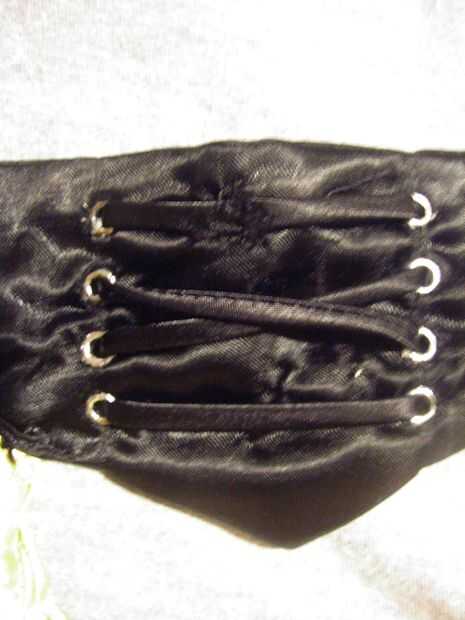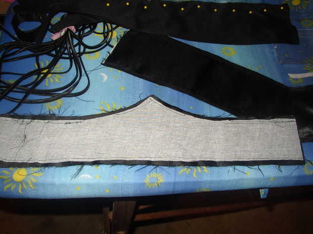 Después el punto si apunta a su gusto, presione la pieza de cuello con un hierro y tampoco dejar de lado o no como lo hice y procede hacer los agujeros a través de los lugares donde quieren sus ojales y los introduzca.  Si decide introducir los ojales ahora, puede el neckpiece de encaje y apriete los extremos de la lazada en la parte posterior para fijar.  Sólo necesita suficiente cordón para pasar por todos los bucles en el patrón de cordones que desee, como el cuello no atar u o un arco. (El enlace es para ver el cuello y el cinturón).