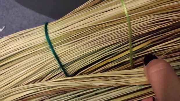 Tomar la cuerda que tienes y atarla alrededor de las cerdas de la escoba A traerlos más cerca juntos. Esto reduce el espacio que tienes para cubrir con las cerdas de B así como lo que es más robusto para trabajar con.