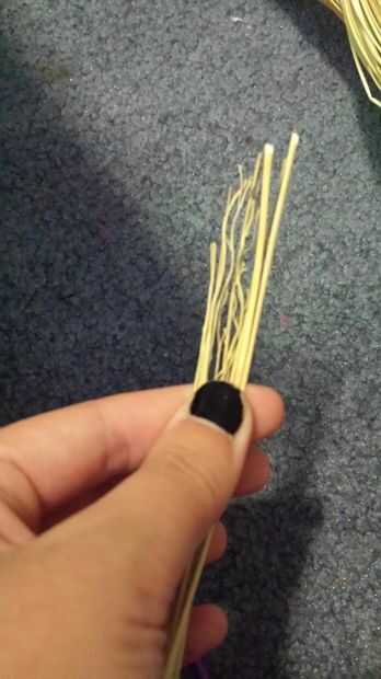 Cuando el pegamento está listo para usar que puedes empezar por recoger un puñado de paja. Lo suficiente como para sostener entre el pulgar y el índice. Se les alinean lado a lado antes de continuar.