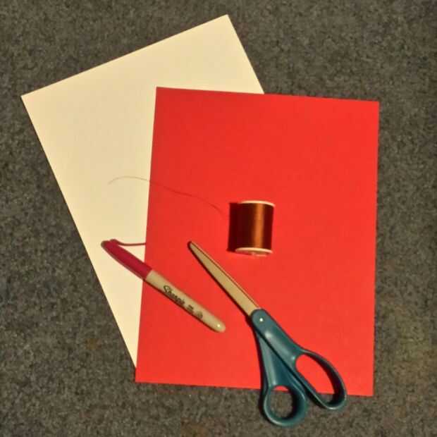 Para este paso necesita el paño rojo, papel grueso, tijeras, aguja e hilo y algo para escribir con. Asegúrese de que están muy cerca para que usted tenga que moverse mucho durante este proceso. (paño rojo no se muestra en la imagen de arriba, ya he completado el arco)