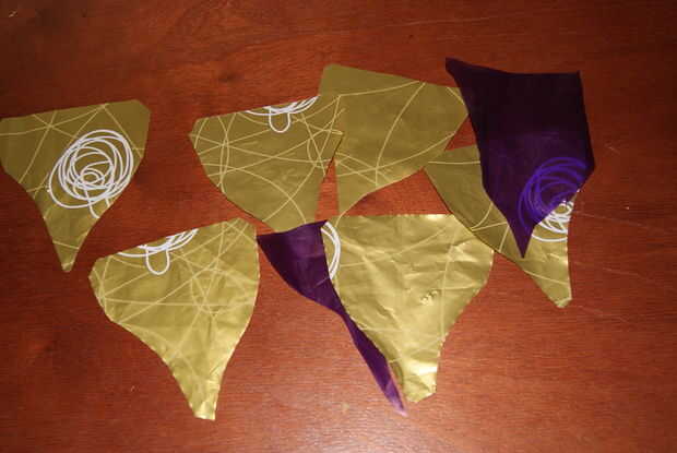 Cortar formas de escala de los colores - necesita unos 150 de estos (para un adulto más bien corto) puede tomar un atajo y acodar las bolsas de plástico antes de cortaron - luego puede crear cargas de escalas con tijeras para unos pocos.
