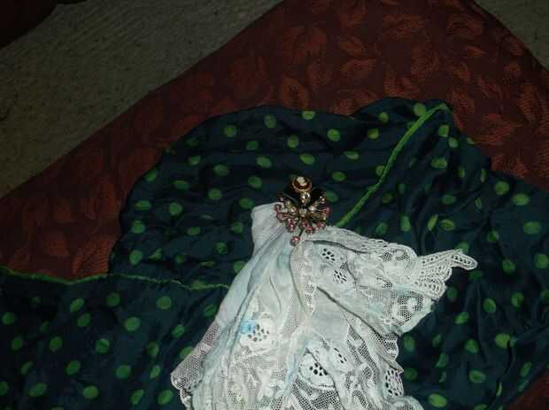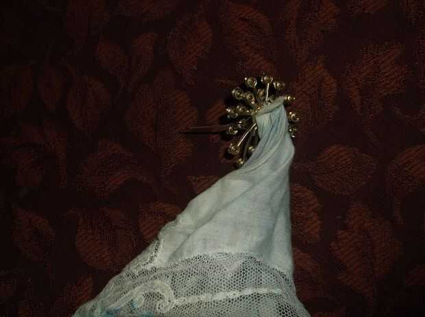 A continuación hice el perno para sujetar a una bufanda que planeaba llevar atado a mi cuello. Encontré uno similar a la de las ilustraciones originales. Cosí el pañuelo detrás del broche para que lo cuelgue sobre la bufanda.