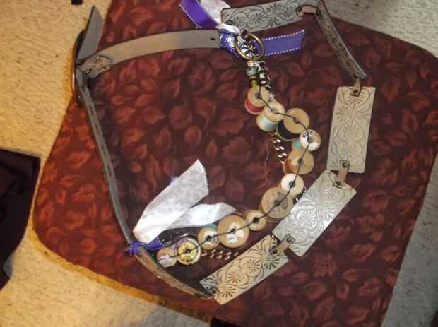 Elegido un cinturón que me ha gustado mucho. Yo adjunto carretes de hilo con cadena juntos en un patrón de escalera y luego anillos de metal en cada extremo. Con los aros de metal até con cinta la escalera del hilo a la correa.