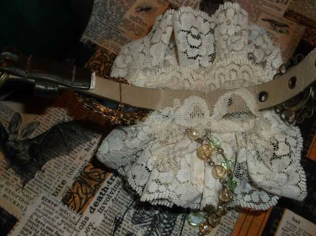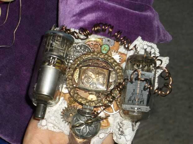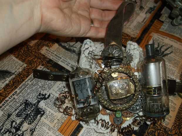 Esto hice con varios artículos de mi escondite, mucho pegamento y un viejo cinturón que convirtió en una correa para la mano. Usé una variedad de tubos de vacío, partes de relojes y joyas en una pieza de madera que encontré en Michaels. También solía cordón para cubrir el pegamento en la parte inferior que sirve para conectar el cinturón (que corta a la medida).