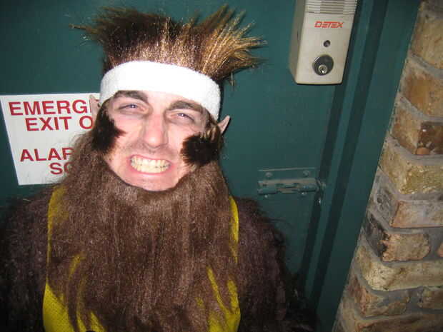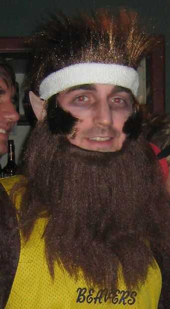 Usaba una peluca de hombre lobo y la barba de hombre de la cavernas en consigue el look de Teenwolf pegando las patillas de la peluca a mi cara, hacen cortar el bigote de la barba y la aplicación de cara morena. Adjunta el orejas, diadema, pulseras y vestía pantalón de calentamiento de baloncesto.