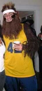 Encontré una camiseta amarilla y planchada en el número 42 en el frente y la parte posterior de la camiseta. Tomé el cuello marrón y cortar tiras del pelo y comenzó a conectar a la camisa con pegamento para tela a lo largo de los brazos y el pecho para que le cuelguen hacia abajo.