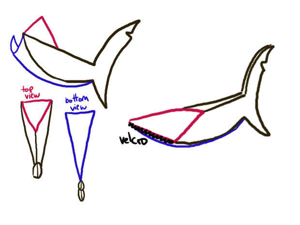 Sacó de una forma de cola de tiburón, entonces dos triángulos, en el periódico un patrón áspero. Una de ellas fue bastante corta - uniría a los lados de la cola en la parte superior, en la parte delantera. El otro triángulo era más largo que la longitud de la parte principal de la cola y se uniría a los lados de la parte delantera de las aletas. Coser primero el triángulo superior a los lados de la cola, suturan las partes de la aleta de la cola, luego coser la pieza de triángulo inferior en la parte inferior de los lados de la cola. Rellenas la cola con relleno de fibra, luego suturan los extremos del dos triángulo.