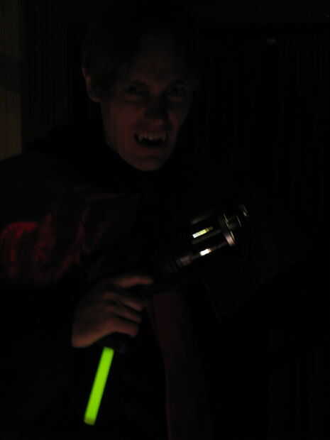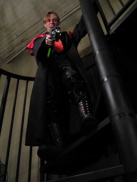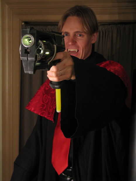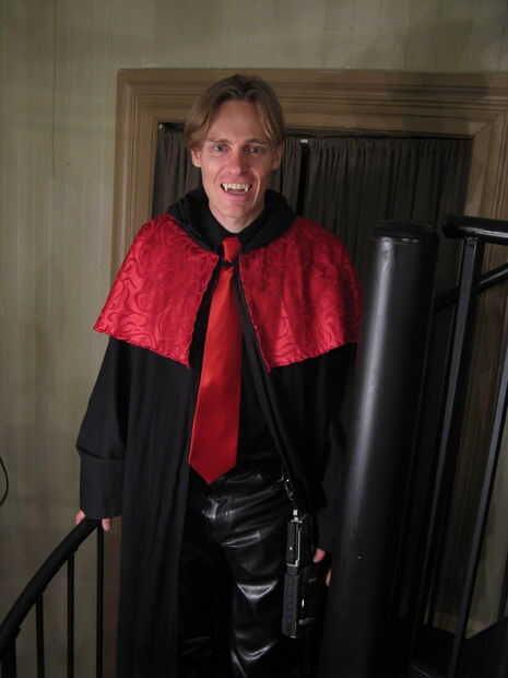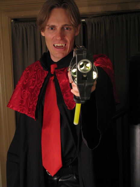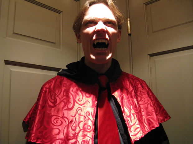 Nuestros trajes incluyen colmillos caseros que encajan sobre los dientes, esculpidos por el papá de dentista de Christy, Bob Canida; capas con capelets rojo y demás ropa elegante. También llevaba un accesorio de arma de caza vampiro.