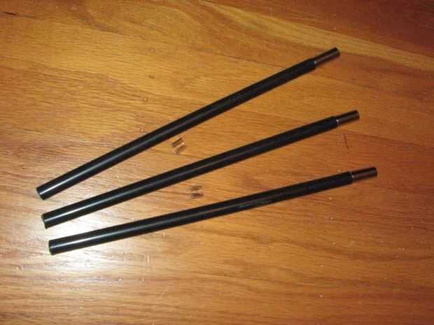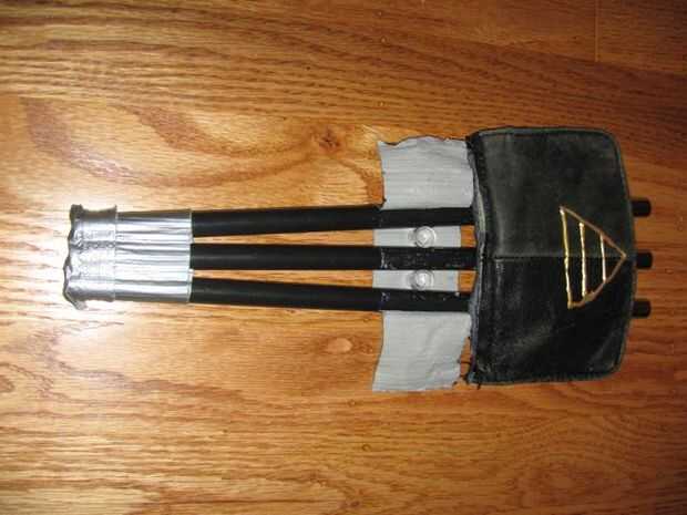 Ahora splay sus tres tubos principales hacia fuera en un ángulo leve, colocar tus dos distanciadores entre ellas para mantenerlas ligeramente separadas en ángulo y tubo con cinta adhesiva en su lugar. (Nota: encontré mi espaciadores salte de vez en cuando entre mis tubos a pesar de la cinta del conducto, puede reforzar con palitos o pegamento los espaciadores en su lugar para evitar este problema.) Conecte los tubos de extremo del metal en las puntas de los tubos principales. Asegúrese de que los tubos de extremo firmemente en su lugar y lo más importante, asegúrese de que son rectos por lo que las garras todavía deslicen libremente. Cinta entonces la pieza de cuero por encima de los tubos principales por lo que se esconde donde se unen los tubos principales y finales. La pieza de cuero que salen de la manga de la chaqueta y colóquela sobre el guante. Por último, carga sus garras en a través de la parte trasera de los tubos principales y tapón y cinta adhesiva los extremos traseros.