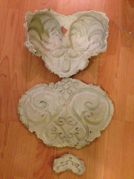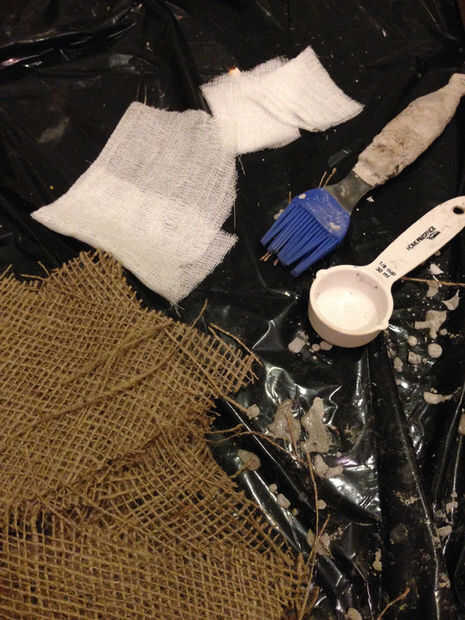Hice copias de moldes rígidos/negativa de mi coraza, placa y 'medallón de corsé' utilizando Ultra-Cal 30. Mezclé la UC30 con agua, agregar poco a poco, hasta que llegué recibí una mezcla aproximadamente la consistencia de "barro de río". Chapotea en una capa de este sobre la esculpe con un pincel de silicona, asegurándose de que no hay burbujas de aire. Una vez que el área es cubierta agregar otra capa de la mezcla UC30, este tiempo sumergir plazas de estameña necesita reforzar su molde que chapotea en Ultra-Cal recubierto cuadrados de Gasa! (O arpillera. Me parece arpillera que messier).