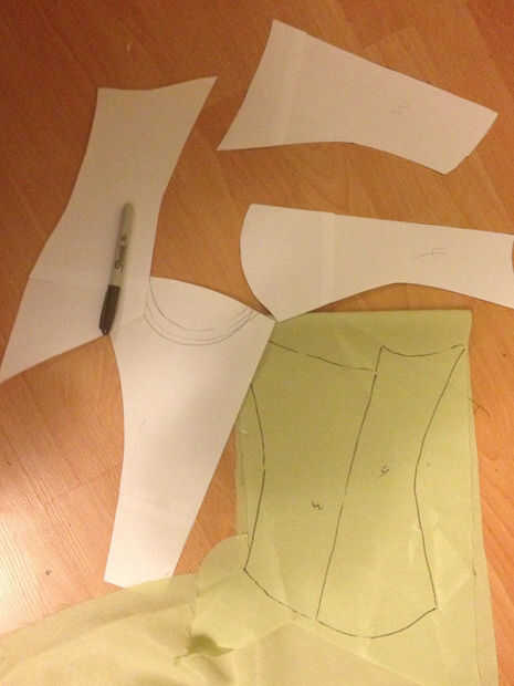He medido los "puntos clave" de mi torso (Busto natural, bajo pecho, cintura, caderas) y Comparado con las mediciones del verdadero patrón de corsé de Xena (por cada pieza en los puntos de medición, les sumando y restando margen de costura). Luego dibujó nuevamente el patrón para que coincida con mis medidas. Luego cortar el patrón de una tela de prueba y coser todo junto. Lo probé en el, y realmente cabe (me emocioné bastante). Pero no se desanime si tiene algún ajuste para conseguir que encajarán bien. Basado en este prototipo medir y cortar las correas de hombro y un faldón. También he probado a añadir el deshuesado para el corsé.