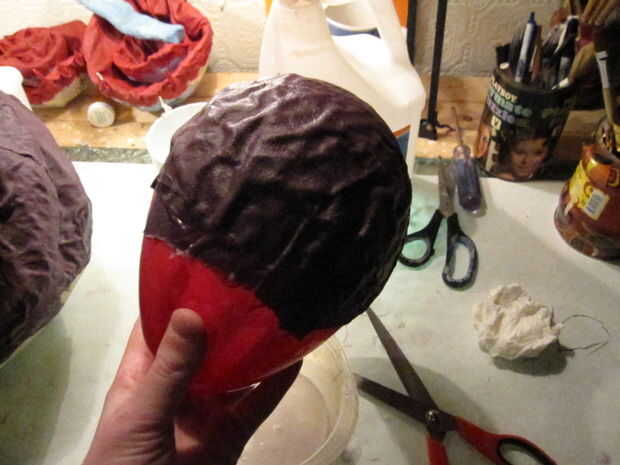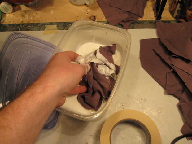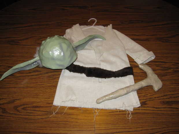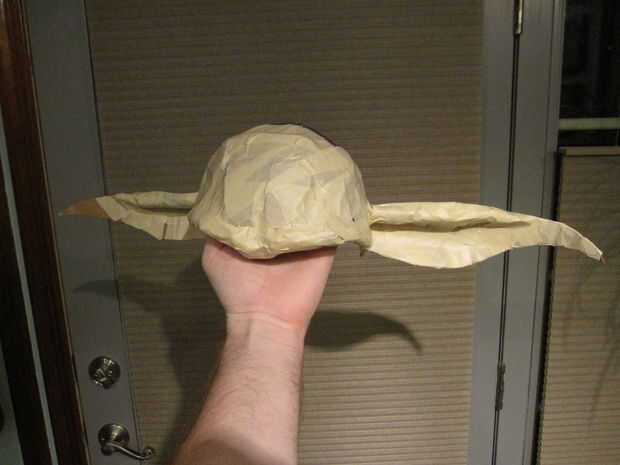 Para empezar, explotó un globo del tamaño de la cabeza de nuestro bebé. Luego cubrí el globo en tela (una sábana vieja) que fue sumergido en Elmers pegamento. Eran necesarias varias capas y tardó aproximadamente una semana para todo seco y duro-a. Este gorro es una buena base para orejas de Yoda. Para hacer las orejas cortar un cartón y plegado y había doblado en forma de buen oído. Grabó las orejas al gorro y utiliza gran cantidad de cinta para crear una agradable forma de Yoda-cabeza a todo. Para todo lo conseguir agradable y suave cubrió toda la cabeza con pegamento blanco y toallas de la tienda. Esto crea una piel sobre la cabeza. Las toallas de la tienda tienen una textura que les para alisar hacia fuera pinté en varias capas de pegamento blanco, permitiendo que cada capa se seque en el medio. Después de lijar ligeramente preparado y pintado de verde con cepillado de aire un poco de detalle de la cabeza... Usé algunas cosas de decoración de tela de araña de Halloween para crear algunos mechones de pelo blanco detrás de las orejas.