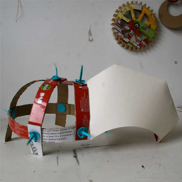 Utilice un Makedo nuevo pin para conectar el punto medio de la tira justo donde la parte superior del pico se une a la estructura. Los lados hacia abajo, siguiendo la forma del pico de la curva. Conectar a la base de la estructura. Recorte cualquier exceso de longitud.