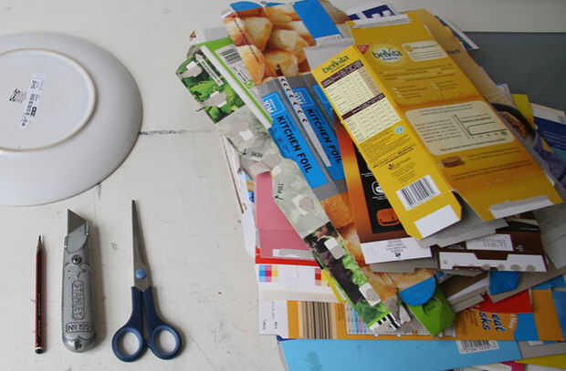 Usted también necesitará un lápiz, cinta, tijeras, cuchillo, plato grande, una gran caja de cartón corrugada de medición junto a su gran colección de coloridos envases domésticos.