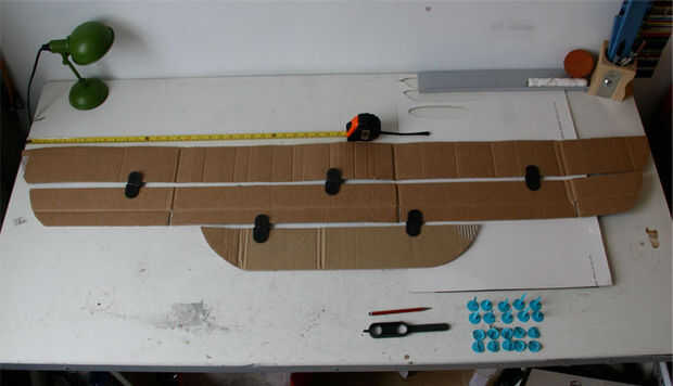 Alinee las 3 tiras como se muestra y espaciar uniformemente 3 bisagras entre las tiras superior y 2 en la parte inferior. Perfore agujeros a través de las bisagras y fíjela con Makedo de nuevo los pernos.
