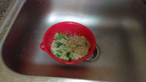 Una vez que los fideos son suaves y las verduras estén cocidas, escurrir el bote entero en un colador. Dejar eso a un lado por ahora mientras calienta la proteína.