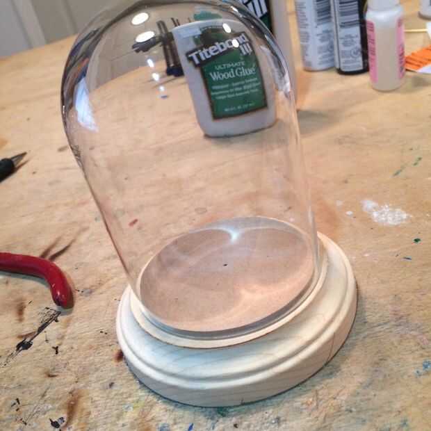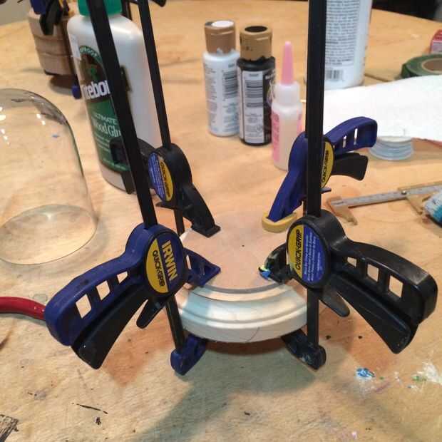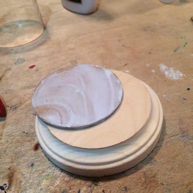 Añadir pegamento para madera a la parte inferior de 1/8" disco y centro de lo mejor posible sobre la base de madera comprada. Prueba colocar el frasco para asegurarse de que se ve centrado. Esta suma se utilizará para sujetar la jarra segura en la pieza final. Si se centra bien, abrazadera y quite cualquier pegamento extra con una toalla de papel húmeda y deje curar durante la noche. Esto se convertirá en la parte superior de la base.