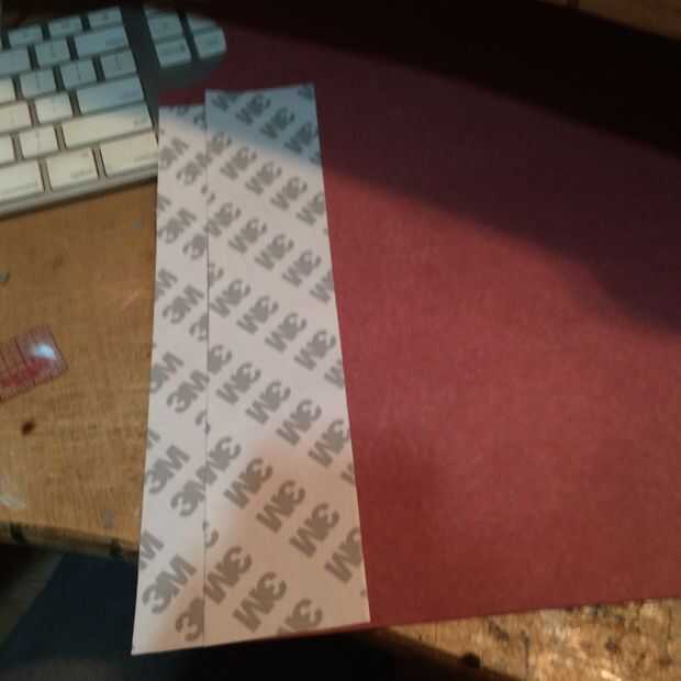 Ahora terminaremos el interior donde va el anillo. Dependiendo de si fue con un compartimiento más grande o no dictar cómo terminarlo. Me voy para la presentación de un solo anillo, así que sólo tiene un agujero. Utilizando el papel de terciopelo rojo o cualquier acabado de papel que desea utilizar, aplique la cinta de doble palo en la parte posterior de la misma. Creo que es más fácil aplicarlo antes de la corte de la hoja.