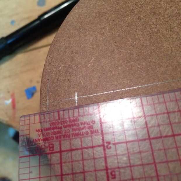 En la parte inferior de la base, conecte el punto desde el agujero del pivote y el agujero central. Ahora, mida la distancia desde el borde de la parte superior de la base al centro del imán. Agregar en 1/8" para el grosor adicional de la parte inferior de la base, medida al punto central de donde debe estar el imán en la parte inferior de la base.
