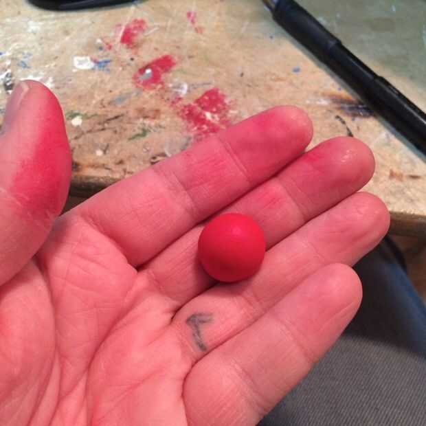 Tomar una pequeña bola (tamaño de una canica pequeña) de la arcilla de hornear horno rojo y amasar hasta que se calienta para arriba. El pigmento rojo se desprenderá en las manos. No te dolerá, pero sucederá.