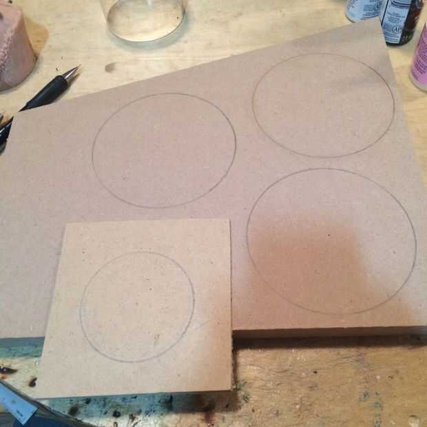 En el MDF de 3/4" dibuje tres círculos que son 1/4" más amplio que la medición del OD de la base de madera comprada. Mina fue 3,9", por lo que se dibuja un círculo que es 4-1/8" de diámetro.