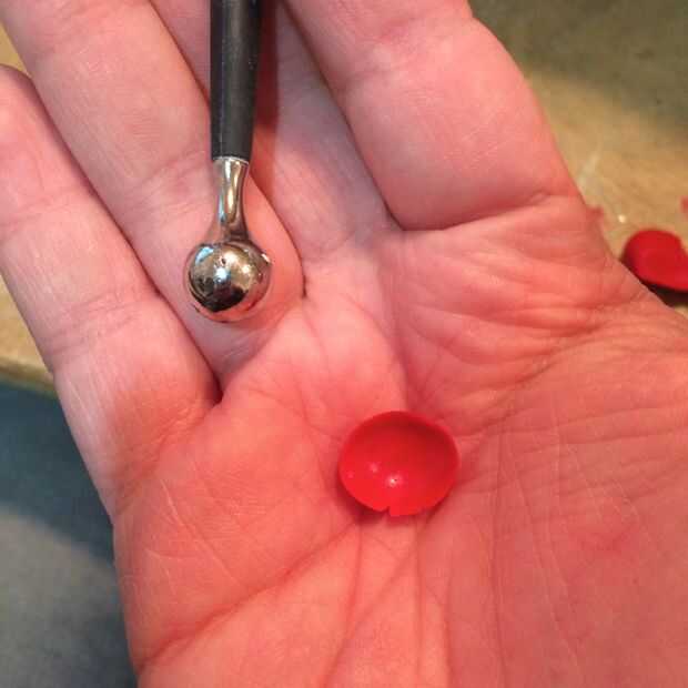 Si tienes herramientas de escultura, gran, si no puede utilizar sus dedos para este siguiente paso. Lo importante a tener en cuenta es que necesita lubricación. Tomar una de las bolas del tamaño de un guisante y colóquelo en la palma de su mano. Tomar con los dedos o una herramienta sculpting redondeada y mojado con su saliva. Sí, libre de lubricación. Agua no funciona así. Aplane la bola en su palma con un movimiento circular. Si la arcilla está pegando a la herramienta o el dedo, necesita más saliva. Estamos haciendo pétalos, por lo que pueden ser bastante delgadas, pero la forma general debe ser una forma de "U" sólido.