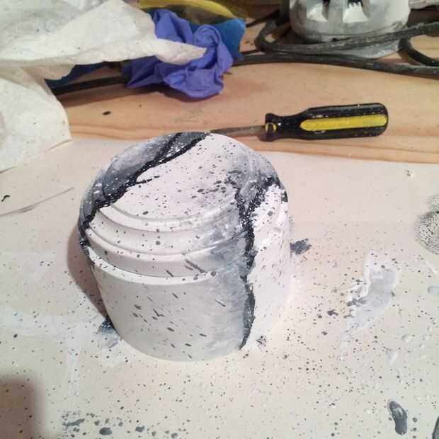 Una vez seca la base, saturar el cepillo otra vez y mezclar agua con algo de blanco. Desde una altura de aproximadamente un pie por encima de la base, pulse repetidamente el metal ferrel del pincel sobre la carne de la mano debajo de su pulgar mientras que el objetivo en la base. Esto salpicará pequeñas gotas de pintura blanca en la base.