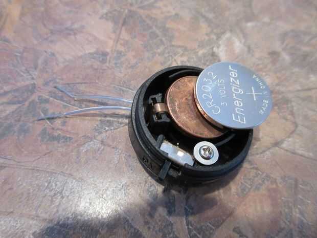 3. Los paquetes de baterías que compré fueron pensados para dos pilas CR2032. Esto era más tensión que el LED necesitado, usé dos monedas como distanciadores. También se podría utilizar a cualquier espaciador metálico tamaño de batería (por ejemplo, arandelas, etc.).