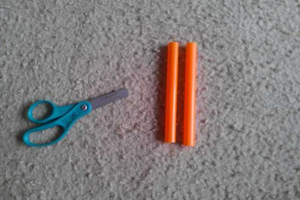 En primer lugar, cortar cada paja por la mitad con las tijeras. No te preocupes de cortarlos perfectamente.