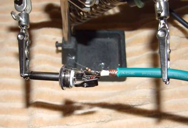 Solde un resistor de 1/8 watt 10k para cable interno aislado del cable. Puede utilizarse cualquiera de los extremos de la resistencia.