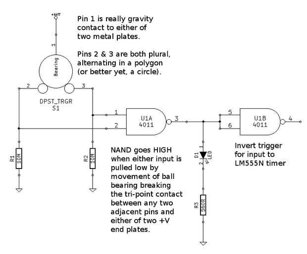 En esa posición la bola de metal corto dos adyacentes bares a un tambor u otro. Punta en cualquier otra dirección y uno de esos contactos de triple punto se rompe, al menos momentáneamente. En el balanceo sobre una barra la bola debe perder el contacto con el otro. Respecto del bar se pierden ahora, positivo, ahora tiene ningún camino al positivo pero solo su camino de tierra a través del resistor. La señal cae de alto a bajo. Esa misma bola, en el balanceo del contacto con cualquier cabeza del tambor permite adyacentes tanto barras de caída a la baja. Además si la bola rebota, sin embargo como mínimo.