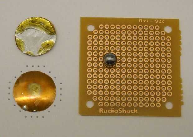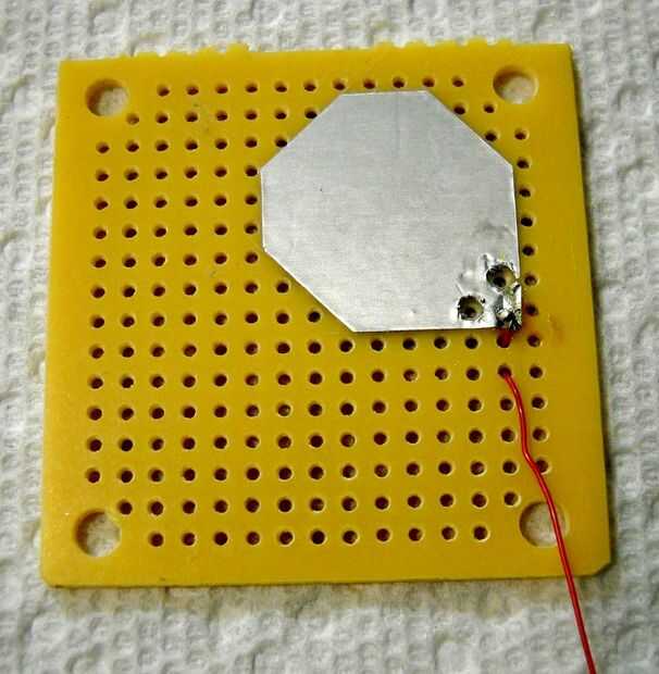 Nota: Sí, es cierto. Para el Mk1 diseño suelda alambre calibre 30 envolver alambre de aluminio. Usé un hierro 700F y semi ordinaria 63/37 de soldadura desde Radio Shack. No fue fácil. Tampoco es muy probable que el mejor de los empalmes de la soldadura. Pero trabajó para un prototipo. Si tuviera que hacerlo otra vez, lo haría en su lugar uno de los siguientes: A) encontrar una fuente para la cinta de lámina de cobre; o B) utiliza una pequeñita 1/8", 00-80, tornillo de cabeza redonda para presionar físicamente mi cable contra el aluminio a través de uno de los orificios perf board; o 3) [como sabiamente sugerido por el comentarista 1] cinta firmemente hacia abajo cable confiando en contacto físico. Personalmente, sin embargo, no se haciendo esto tan crudamente a mano otra vez. En cambio, se, corroerse despu6s un PCB personalizado por lo que puedo hacerlo redondo en vez de un polígono de feo. Cuando llegue ese momento, subiré los archivos Gerber aquí así que usted puede hacer lo mismo. Para el diseño de Mk2 que me quedé solo en el cable a la rellenada de la soldadura mientras que todavía fundido.