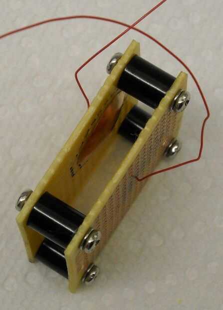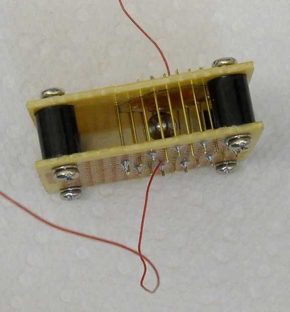Ahora mire bien en el Mk2. Los pasadores son todos tan recto como era posible con los tableros de perf de Radio Shack. Los patrones de dos agujeros se alinean tan bien como esperaba. Por lo que las barras son ligeramente askew. Pero al menos son todas equlally askew y eso es un avance enorme. Como lo que hice fue, partes de cobre, físicamente acoplado tableros de Mk2 entre sí por una distancia ligeramente mayor que el diámetro de su rodamiento solicitada más la altura de las dos placas convexas, como sigue: