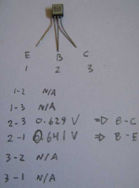 La tarjeta de flash con el transistor en él muestra cómo averiguar el pinout de un transistor NPN de desconocido. Con un multímetro en modo de prueba de diodo, usted encontrará que la ensambladura del emisor de base tiene un mayor potencial que la Unión base-colector.