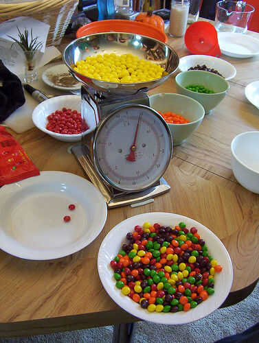 Es necesario terminar con 180g de cada sabor de bolo. Bolos son aproximadamente de 1g, puede lograrlo con bolos de 180. Utilizamos dos bolsas de 450g para nuestro experimento, otros tamaños de bolsa son perfectamente aceptables.