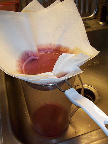 El método original que se utilizó para ello fue correr el líquido por un filtro hecho de varias capas de toallas de papel hacia abajo en un colador. Como ha señalado varios comentaristas, es probable que ese filtro de café podría ser una solución mejor que las toallas de papel. Nosotros no hemos probado nosotros mismos, pero suena bastante razonable y no vemos ninguna razón por qué usted no debería intentarlo.