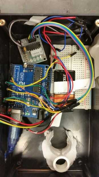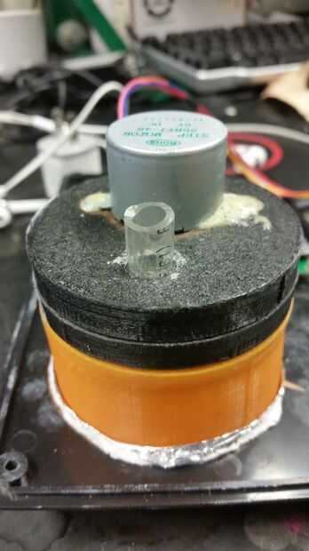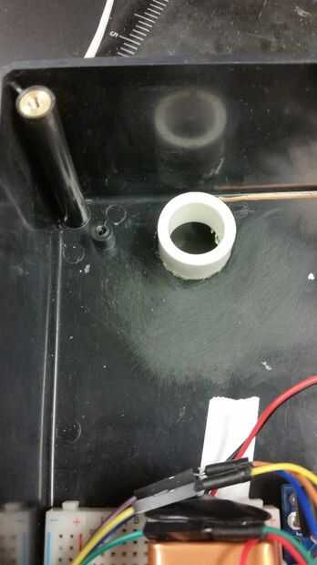 Masilla de epoxy fue utilizada como un sellante y adhesivo. Una pequeña sierra, cortador de la caja y taladro fueron utilizados para cortar agujeros en la caja para hacer los huecos para el depósito dosificador, salida del dispensador y para el receptor de infrarrojos. La leva de la masilla de epoxy en mano a limpiar los agujeros y hacer los componentes que aparecen más al ras con el gabinete, limitación de movimiento no deseado. Una pieza adicional de la tubería fue unida a la salida de material directo mejor salir el dispensador el dispensador.