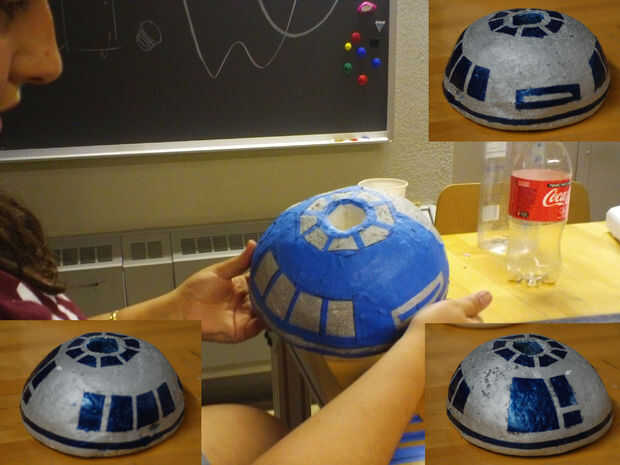 El siguiente paso es hacer otra plantilla para la cabeza de R2D2 donde la plantilla se hará fuera de cinta de pintor. De rociar las áreas donde está expuesta la cabeza de la plantilla con pintura azul metalizada. Después de que la pintura se seca se puede quitar la cinta de pintor y te queda una cabeza de R2D2 cuidadosamente pintada. Estos pasos se pueden mostrar en el cuadro 5.