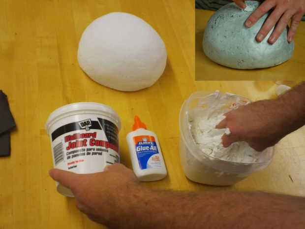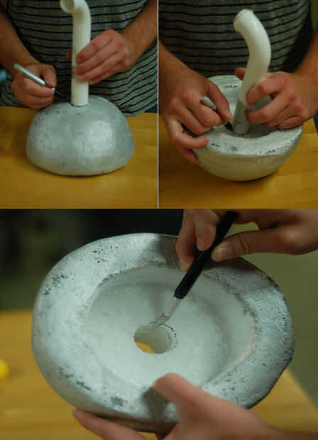 El siguiente paso es tomar la mezcla y se mezcla con pegamento de Elmer. Luego separó la mezcla en la parte superior de la espuma de poliestireno y dejarlo reposar 24 horas. Después de que el compuesto para juntas de secado puede ser enarenada y alisó abajo (lija de grano 120 de uso). Después de que la forma se alisa hacia fuera la espuma de poliestireno puede ser rociada con una pintura de aerosol metálica de plata. Estos pasos se muestran en el cuadro 3.