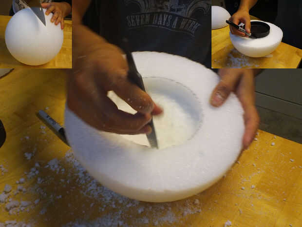 El siguiente paso es tomar el tubo de PVC que va a ser el tubo donde llena el R2D2 con líquido. Tomar el tubo de PVC y trace círculos en la parte superior e inferior de la cabeza de espuma de poliestireno. A continuación cortar un agujero directamente a través de la cabeza de espuma de poliestireno usando un exacto cuchillo y destornillador de cabeza plana (o cualquier cosa que funcione para usted). Asegúrese de que el tubo se adapta cómodamente dentro del agujero. Estos pasos se muestran en el cuadro cuatro.